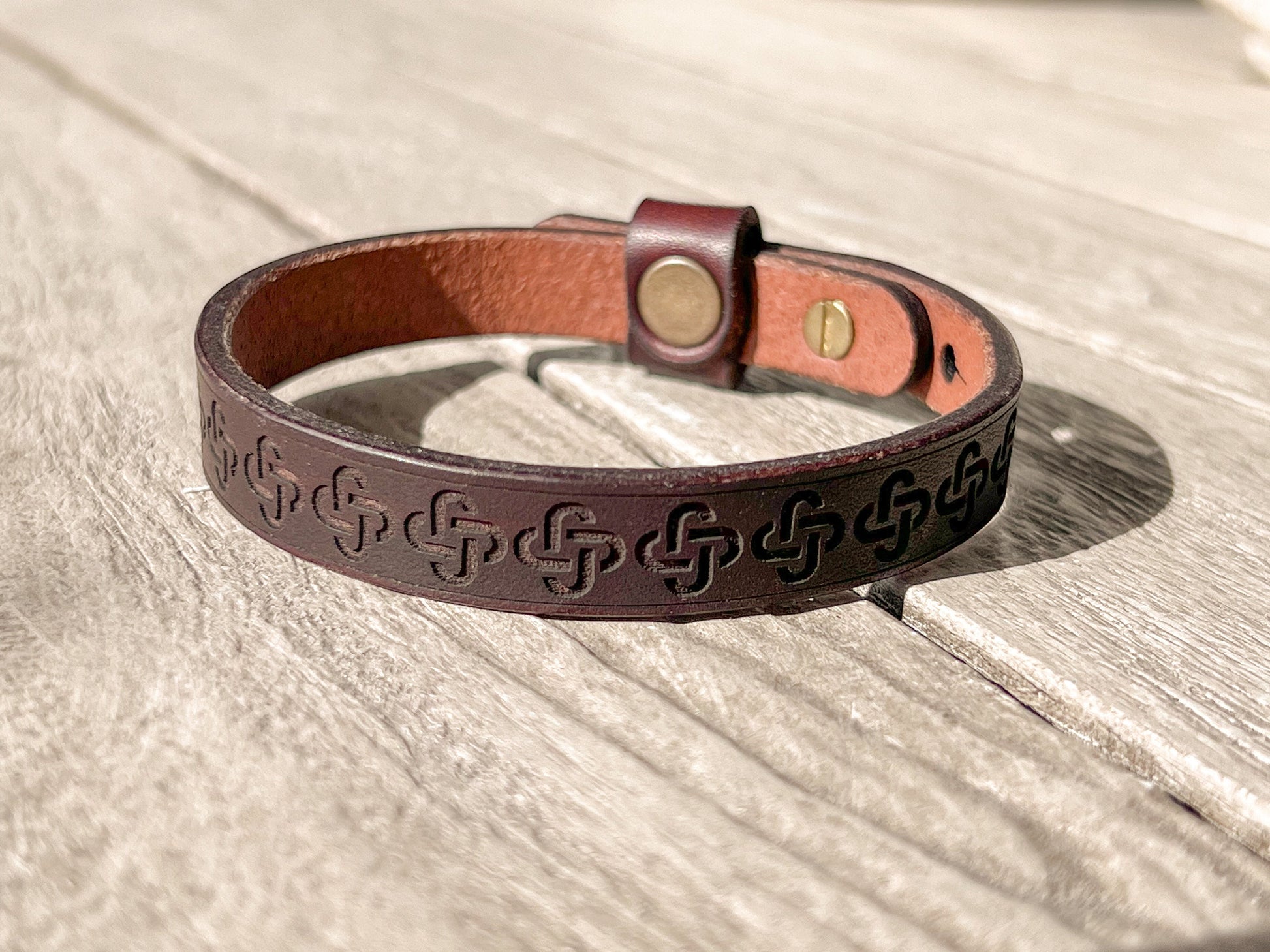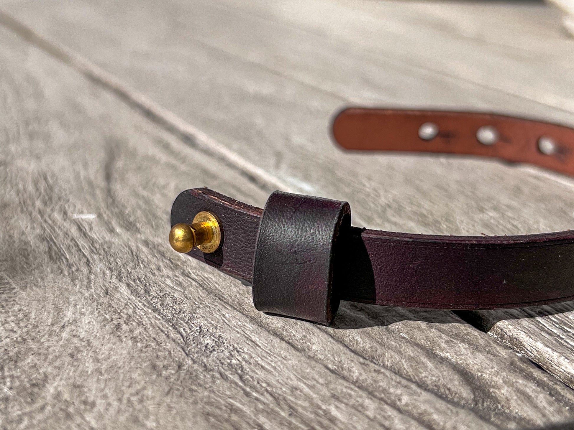 Handcrafted from premium vegetable-tanned harness leather, this chic leather cuff bracelet features a solid brass button stud and keeper. Its rich patina deepens with age, growing more beautiful over time. Customize it for free with engraved names, initials, hearts, symbols, dates, or coordinates. Shop now for a timeless, stylish piece that only improves with wear.