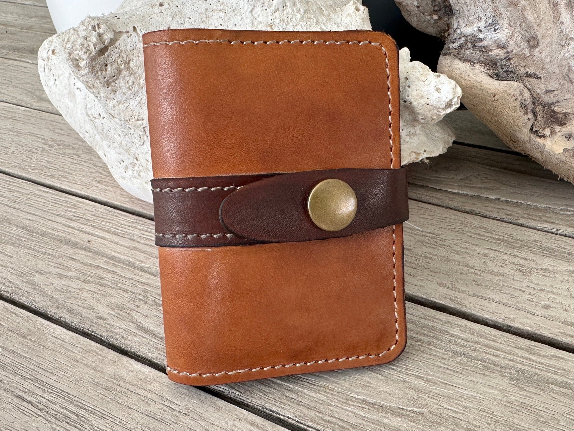 This sleek leather card holder, crafted from full grain leather, holds 16 cards with a snap clasp. It develops a rich patina over time and offers free custom laser engraving (name, initials, date, or symbols). Perfect as a personalized 3rd anniversary gift, it fits effortlessly in a pocket or handbag.